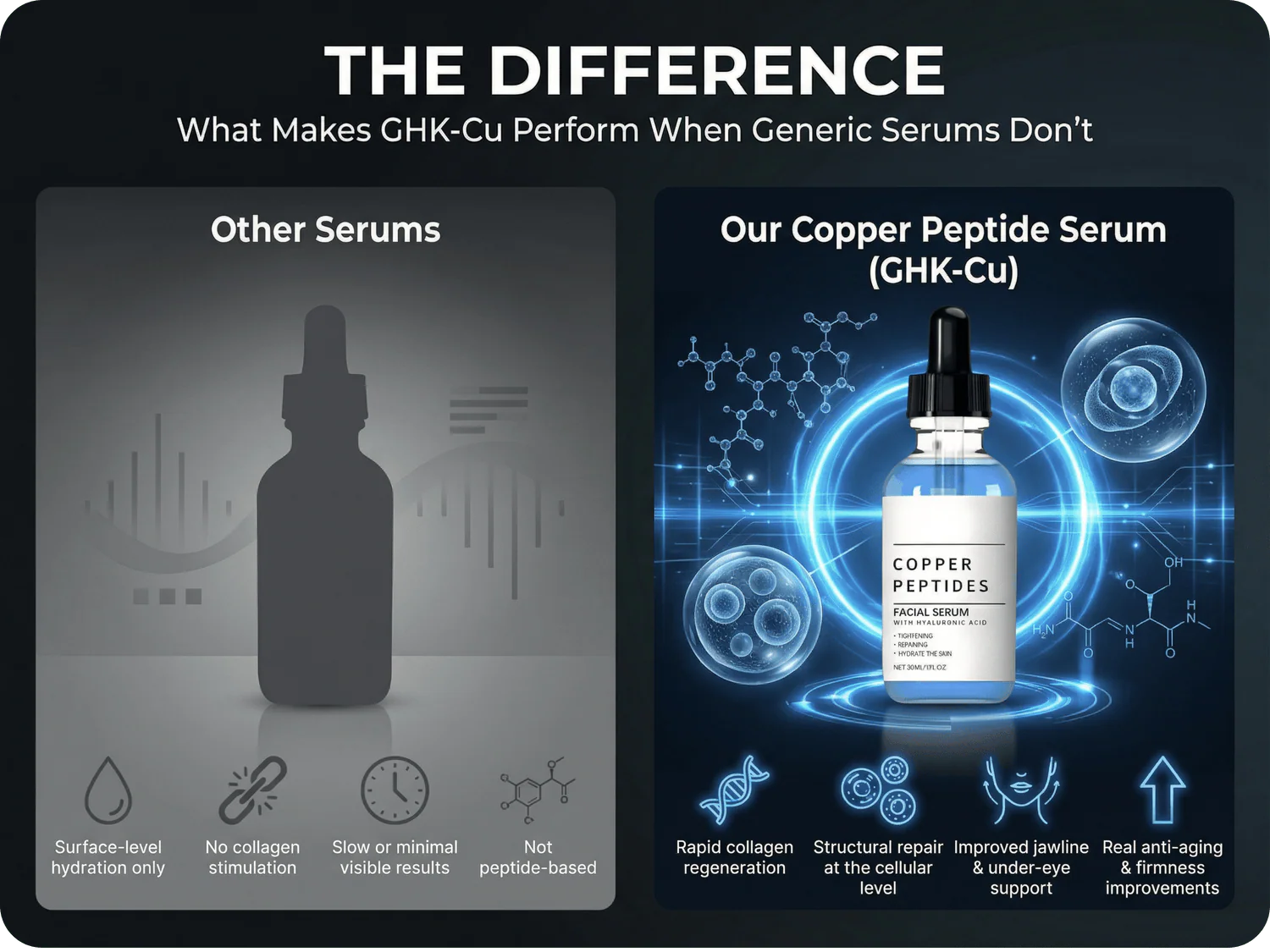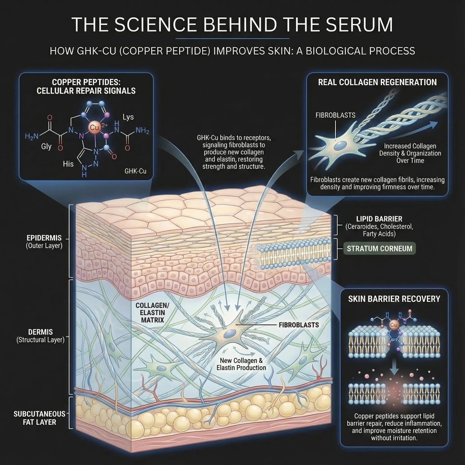 GHK-Cu is one of the rare compounds clinically shown to stimulate new collagen production, not just provide surface-level hydration. It supports real, measurable structural improvement in the skin.